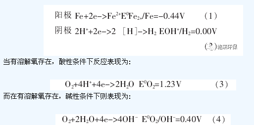 所用材料的鑄鐵屑和活性碳或焦碳,鑄鐵屑是鐵和碳的合金,其內(nèi)部主要由純鐵和碳化鐵(Fe3C)組成,其中Fe3C以極為細(xì)小的微粒分散在鐵屑內(nèi)。當(dāng)將鑄鐵鐵屑浸沒在電解質(zhì)溶液中時,由于Fe3C比純鐵更耐腐蝕,二者之間存在著明顯的氧化還原電勢差,這樣便在純鐵和碳化鐵之間形成了無數(shù)多個細(xì)微原電池,純鐵為陽極,F(xiàn)e3C為陰極。另一方面鐵屑與活性碳形成較大的原電池,鑄鐵為陽極,碳為陰極,使鐵屑在受到微原電池腐蝕的基礎(chǔ)上,又受到較大原電池的腐蝕。在這些細(xì)微原電池中,陽極在電池反應(yīng)中表現(xiàn)為失去電子被氧化,而陰極得到電子被還原,但反應(yīng)比較復(fù)雜。在微電池中電極反應(yīng)為: