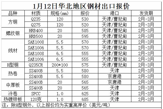 1月12日華北地區(qū)鋼材出口報(bào)價(jià)參考